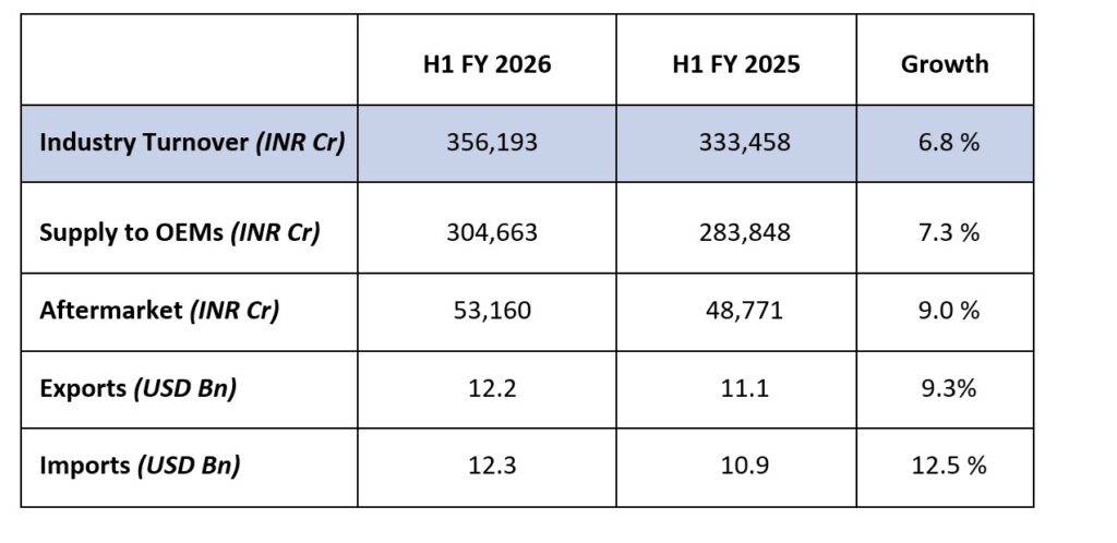Automotive Component Manufacturers Association of India (ACMA) has announced the findings of its Industry Performance Review for the first half of FY 2025–26 (April–September 2025), reporting steady growth for the Indian auto component sector despite global and domestic headwinds. Industry turnover rose by 6.8 % year-on-year to ₹3.56 lakh crore (USD 41.2 billion), supported by stable domestic demand, a resilient aftermarket and continued investments in capacity expansion, localisation and technology upgrades.