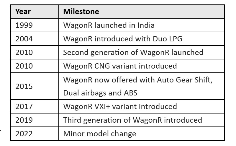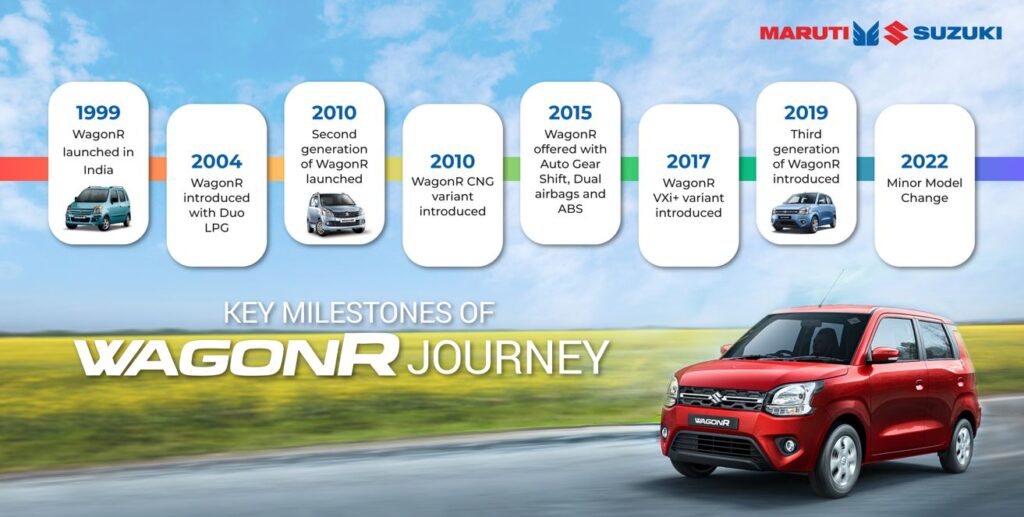 Since its debut, the WagonR has seen multiple milestones, including the introduction of LPG and CNG variants, the launch of its second and third generations, and the addition of features such as Auto Gear Shift, dual airbags and ABS. The model has consistently adapted to changing customer expectations while maintaining its core strengths.